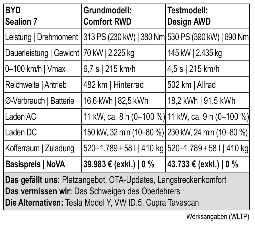 Der LFP-Akku (BYD-Paradedisziplin der ersten Stunde übrigens) gewinnt in dieser Klasse klar die Öko-Wertung, insbesondere, da die Ladeleistung bei Kälte nunmehr nur mehr moderat unter der problemstofffreien Akku-Chemie leidet. Zuletzt sahen wir im kalten November beim Schnellladen immerhin noch 180 der möglichen 230 Kilowatt. Wie hält es der Wagen mit der Effizienz? Nun, unser Dauertestverbrauch pendelt übers Jahr stabil um die 23,5 kWh/100 km. Autobahnetappen im „Verbrennertempo 130 plus“ kratzen an der 30er-Marke, auf urlaubsbedingten Wegen in Osttirol zeigte der Sealion im „Auffi-Obi-Betrieb“ einen Durchschnittsverbrauch um die 15 kWh/100 km.