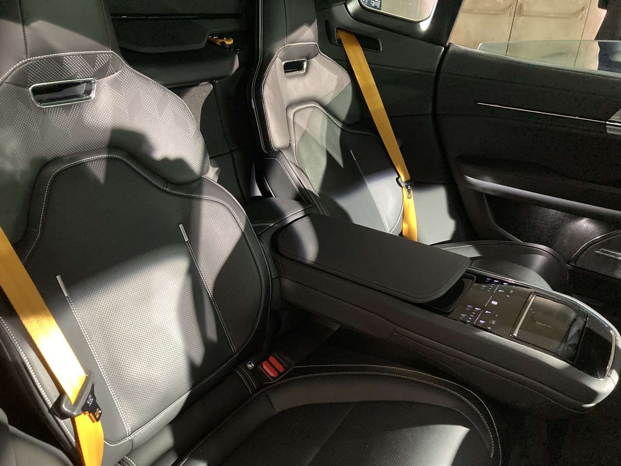 Die Sitzprobe hinterließ einen eher sportlich-straffen Eindruck als einen besonders luxuriösen. Die Materialien oszillieren zwischen edel und „high-tech“, man sitzt tief und genießt das gute Gewissen, von nachhaltigen biobasierten Stoffen umgeben zu sein. Auch die hinteren (Haupt-)Sitze sind neigbar, der fünfte Mittelplatz ist mehr als Notsitz zu verstehen. Durch die nach vorn versetzte Sitzposition soll jedoch ein gewisser Komfort auch zu fünft gegeben sein.