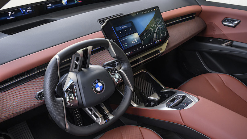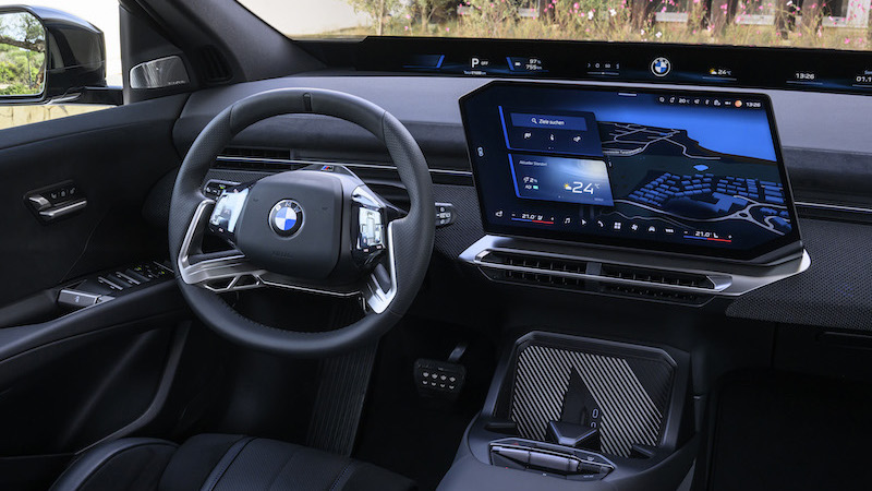 Fahren wir also los, haben wir alle Infos gut im Blick und werden auf den ersten Metern beim Rangieren vom Lenkrad verwirrt – wo ist oben, wo ist unten und warum gibt es keine deutliche 12-Uhr-Markierung, wie wir sie von BMW doch kennen? Egal, wir fahren weiter und schalten den Tempowarner mit einem Tastendruck aus. Am linken Rand des ungewöhnlich geformten Touchscreens befindet sich dafür eine Schaltfläche. Zu sehen ist sie anfangs schwer, denn die rechte Hand am Lenkrad deckt diesen Bereich des Bildschirms ab. Während der Fahrt benötigt man ihn aber nicht mehr. Smoothes Fahren beherrscht der iX3 50 xDrive bestens und trotz der hohen Leistung – der 326 PS starke Synchronmotor an der Hinterachse stammt aus dem eigenen Werk in Steyr, der Asynchronmotor an der Vorderachse fügt 169 PS hinzu – empfinden wir den möglichen Schub ganz schön harmonisch. In gemischten Gefilden, also City, Landstraße und Autobahn, kamen wir bei etwa 18 Grad Außentemperatur auf einen Verbrauch von 15,8 kWh, was schön im vom WLT-Wert (15,1 bis 17 kWh) abgedeckten Bereich liegt. Kollegen mit schwerem rechten Fuß und sportlichen Ambitionen berichteten von 18,8 kWh. Irgendwo in der Mitte wird wohl der im Alltag erzielbare Verbrauch liegen. Leider gibt. BMW keinen City-WLTP-Wert an. Aber für jene Phasen im Leben, in denen man im urbanen Bereich entspannt zwischen A und B tingelt, könnten irre Reichweiten möglich sein. Der Bordcomputer, der stets neben der bei aktueller Fahrweise zu erreichenden Reichweite auch einen von-bis-Wert angibt, hat bei uns sogar über 1.000 Kilometer ausgespuckt. Wie gesagt: Nur, wenn man ganz brav unterwegs ist. Für ein Elektroauto dennoch eine fantastische Zahl, die einen zum Hypermiler werden lässt. Wie dem auch sei: 650 Kilometer sollten im Alltag, der auch Autobahn enthalten darf, durchaus möglich sein.