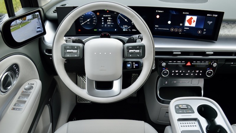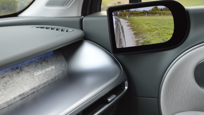 Der Preis des Calligraphy ist zwar heiß – 69.990 Euro würde das 2WD-Basismodell Trend Line kosten –, es wird jedoch viel Luxus geboten, vom elektrisch ausgelösten Sitzumklappen, über Sitzbelüftung auch in Reihe zwei, Nappaleder und Alcantara-Verkleidungen (Dachhimmel, A-/B-/C-Säule innen), 21 Zoll große Felgen mit vielen Speichen, Bose-Sound und sehr viel mehr. Zu den Extras beim Testwagen zählt der Vehicle-to-Load-Adapter (V2L, 390 Euro), mit dem man beim Campingtrip etwa externe Geräte mit Strom versorgen kann. Das Panorama-Glasdach mit integriertem Schiebedach kommt auf 1.490 Euro und bietet zum Glück ein Rollo, was bei modernen Elektroautos nicht selbstverständlich ist. Interessant sind die digitalen Außenspiegel, von denen wir nicht immer ein Fan sind. Im Testzeitraum war nur eine kurze Eingewöhnungszeit vonnöten, dann kamen wir gut damit zurecht. Wer auf analog steht, kann sich die weiteren 1.490 Euro Aufpreis sparen. Ab Prestige Line aber stets Serie: Der Innenspiegel kann von analog auf digital umgestellt werden. Heißt für den Alltag, dass bei einem mehr oder weniger dachhoch vollgefüllten Kofferraum die Sicht nach hinten bestehen bleibt.