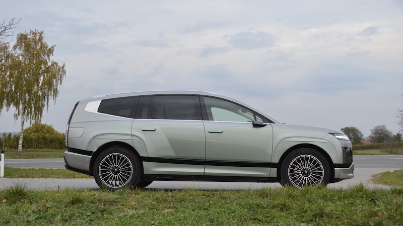 auch als schicke Van-Alternative gesehen werden. Das Design bemüht sich, dem großen SUV die Wucht zu nehmen, etwa mit dem zusammenlaufenden Abschluss am Heck. Auch das grünlich schimmernde Celadon Grey um 990 Euro Aufpreis schafft es, dem 2,6-Tonnen-Ding optisch ein luftiges Flair zu verleihen. Reale 500 Kilometer Reichweite (einen Verbrauch unter 20 kWh schaffen nur Zen-Meister) und schnelles Laden (233 kW dank 800-Volt-Technologie, Hyundai gehörte zu den ersten damit) passen in den harten Familienalltag. AC bleibt Hyundai bei 11 kW. Und mit der Beschleunigung in 5,2 Sekunden auf 100 km/h kann man durchaus Spaß haben, wenn die Kids in der Schule abgesetzt wurden. Bei 200 km/h ist Schluss, falls jemand auf deutschen Autobahnen mit den anderen mithalten möchte.