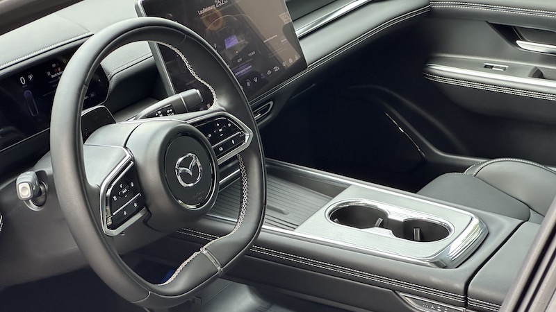 Ein vor dem Einsteigen zurückfahrender Sitz, Gestensteuerung (wie bei BMW), riesiges Head-up-Display mit Augmented Reality und der Kopfstützenlautsprecher, um etwa Telefonate angenehmer führen zu können – so wird beim Mazda6e der große Luxus suggeriert.