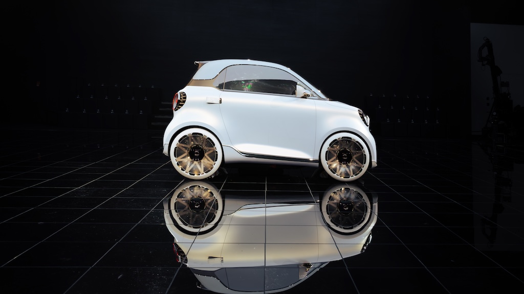Als 1994 Smart gegründet wurde und dann die ersten Fahrzeuge das Licht der Welt erblickten, waren diese dank Uhrenhersteller Swatch noch deutlich verspielter. Mit der Zeit wurden immer mehr edlere Elemente zum Verspielten hinzugetan. Beim Konzept merkt man sofort, die Veränderung nimmt seinen Lauf. Der mattweiße Lack mit goldenen Applikationen und ledernen Details bestimmen das Bild.