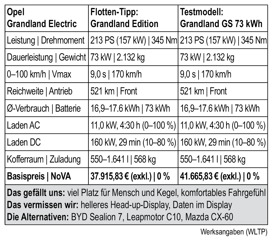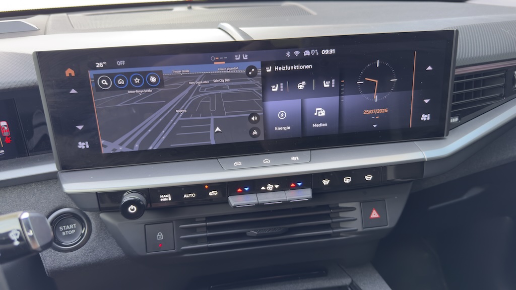 Die wichtigste Neuerung liegt im Antrieb. Dank Stellantis’ STLA-Medium-Plattform fährt der Grandland nun auch als reines E-Modell. Ein 98-kWh-Akku in Verbindung mit einem 213 PS starken Elektromotor soll Reichweiten bis zu 700 Kilometer ermöglichen. An Schnellladern lässt sich die Batterie in gut 25 Minuten auf 80 Prozent füllen – ein realistischer Wert, den der Grandland bei Sommertemperaturen auch wirklich erreicht hat. Sitzt man im Cockpit, so wirkt der Grandland mächtig. Aber auch nicht übertrieben. Komfortable Sitze fügen sich gut in ein durchdachtes Cockpit mit 16-Zoll-Touchscreen und Head-up-Display ein. Hier gibt es den einzigen Kritikpunkt, denn das Head-up-Display ist selbst in seiner hellsten Stufe noch immer zu dunkel. Abgerundet wird das Cockpit durch zahlreiche Ablageflächen für Smartphone, Geldbörse und Co. Im Innenraum setzt Opel zudem auf Nachhaltigkeit: Alle Stoffe bestehen vollständig aus Recyclingmaterial.