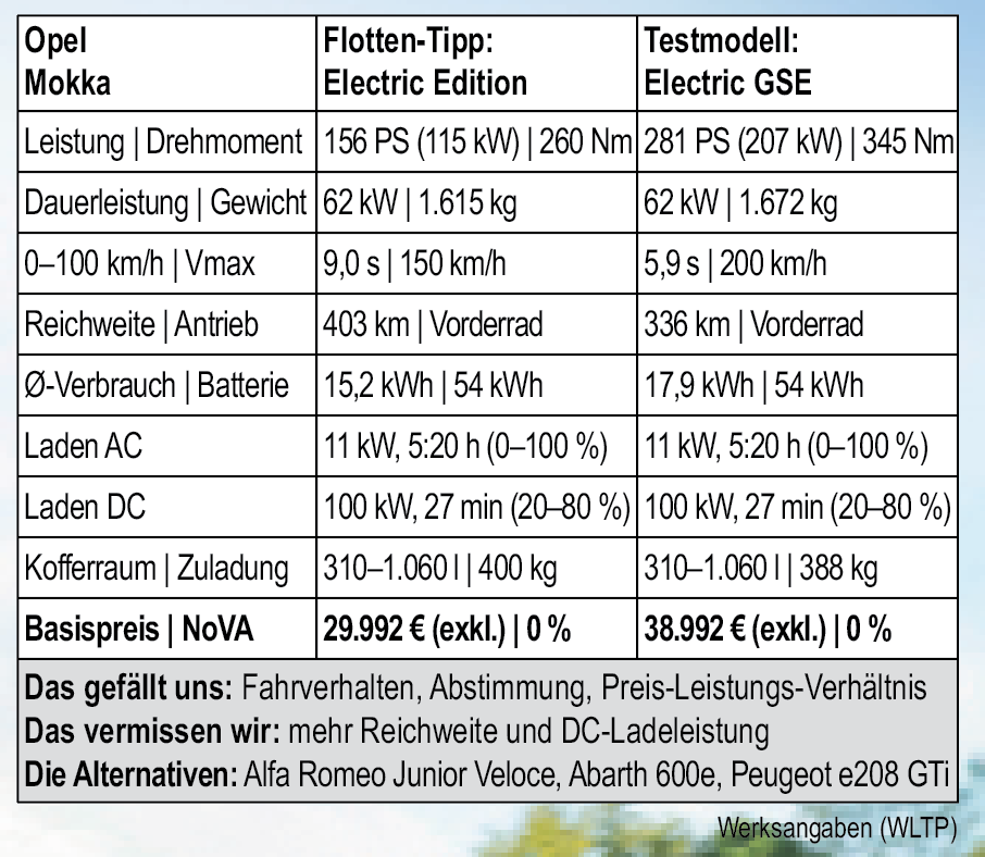 Die Entwicklungsarbeit erfolgte unter Zuhilfenahme und Einbindung der Opel-Werksfahrer wie Calle Carlberg, aktueller ERC4-Rallye-Europameister und auch gefördert von Manfred Stohl, der mit seiner Firma STARD sehr stark in das Projekt Mokka GSE miteingebunden war. Das Resultat ist eine für ein Elektro-SUV – sofern man hier noch von einem SUV sprechen kann – ungewöhnlich präzise Vorderachse, hohe Stabilität beim Einlenken und eine für ein frontgetriebenes Fahrzeug sehr feine Traktion an der Vorderachse. Der Mokka GSE lässt sich präzise platzieren, führt sauber über die Vorderachse und belohnt einen sportlichen Fahrstil mit spürbarer Rückmeldung, Alcantara-Sportsitze sorgen für Halt. Unterm Strich sind 38.992 Euro netto für diesen kompakten Sportler fair eingepreist, Reichweiten- (336 km) und Ladewunder (100 kW DC) darf man aber keine erwarten. •