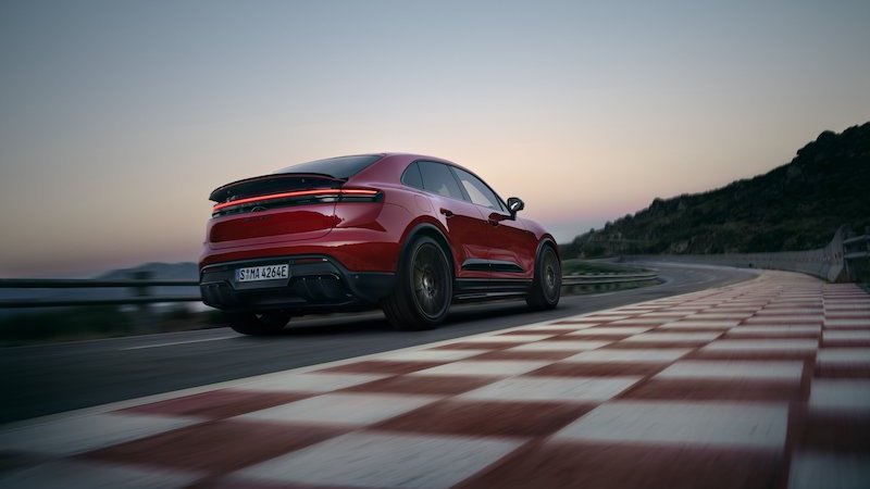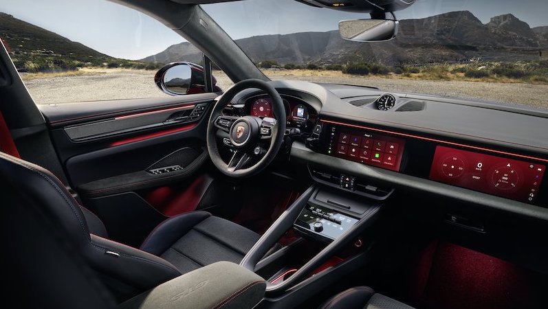 Optisch ist der Neuling an den schwarz lackierten Elementen zu erkennen – typisch GTS! Abgedunkelte Matrix-LED-Hauptscheinwerfer und stark konturierte Außenkanten oberhalb der Airblades finden sich ebenso wie schwarze Einleger, Sideblades, Radlaufblenden und Lippe des adaptiven Heckspoilers. Natürlich wurde auch beim Interieur extra Hand angelegt, der Stoff Race-Tex und schwarzes Glattleder wechseln sich ab. Optional lassen sich gerne noch ein paar Tausender ausgeben: Neben der Hinterachslenkung etwa bei einem eigenen Interieur-Paket, das die Außenfarbe ins Cockpit holt, sprich Gurte, Ziernähte oder GTS-Schriftzüge einfärbt. Wie vom Modelljahreswechsel gewohnt, kann man auch diesen Macan mit Porsche Digital Key öffnen, es gibt neue Parkassistenz-Funktionen, einen KI-unterstützten Voice Piloten, ein erweitertes In-Car-Gaming-Angebot und – Freizeitpiloten aufgepasst – eine auf 2,5 Tonnen erhöhte maximale Anhängelast.