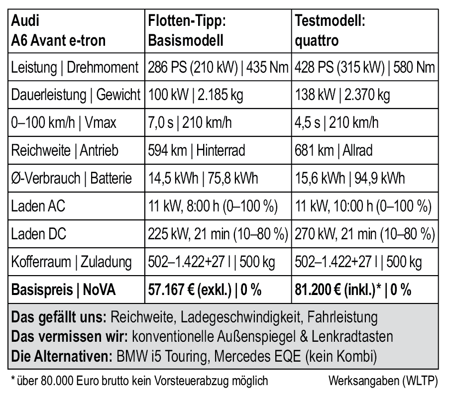 Rein optisch muss man schon zwei Mal hinsehen, um den Elektriker vom normalen A6 Avant zu unterscheiden, die Designer der vier Ringe sind keine Experimente eingegangen und das ist auch gut so. Schließlich sind radikale Elektroauto-Designs schon öfter nach hinten losgegangen, auch im VW-Konzern. Innen folgt der Ingolstädter der klassischen Linie, auch die Bedienung gibt keine Rätsel auf, wenngleich die Touchtasten am Lenkrad ergonomisch nicht perfekt sind. Selbiges gilt auch für die digitalen Außenspiegel, deren Nachteile klar überwiegen. Die flach in die Tür integrierten Monitore lassen vor allem beim Rückwärtsfahren jegliches Raumgefühl vermissen, je nach Lenkrad- und Armhaltung werden diese überhaupt verdeckt (Bild rechts). Kurzum, sparen Sie sich diese 1.705,20 Euro. Das Platzangebot ist ordentlich, wenn vor allem im Fond nicht wirklich üppig, der Kofferraum fasst 502 bis 1.422 Liter, der 27 Liter fassende Frunk bietet Platz fürs Ladekabel.